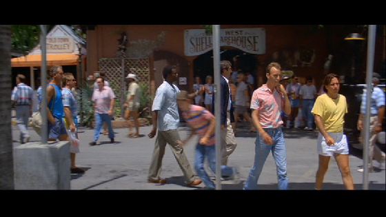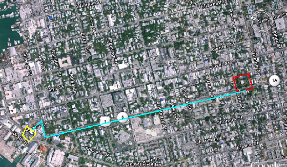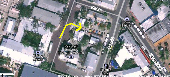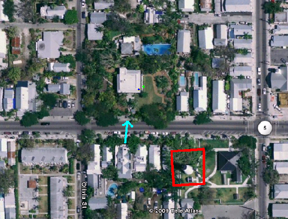 Then with Hollywood movie magic they go from just outside Mallory Square ((Yellow square in picture below ) along light blue line in picture below)) to the street just outside Ernest Hemingway's former house (Red square in picture below) all in the blink of an eye. More than seven blocks away.