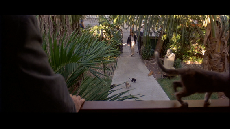 As James arrives at Felix's house we see a funny goof. In the picture above what looks like a mother and son are slowly walking down the sidewalk. She realizes that they are behind where they should be for the shot and tells the boy to hurry up and gestures with her hand to move faster as seen in the picture below.