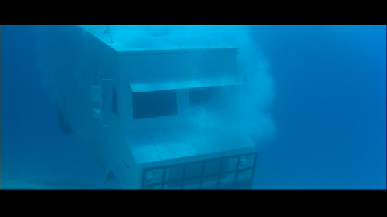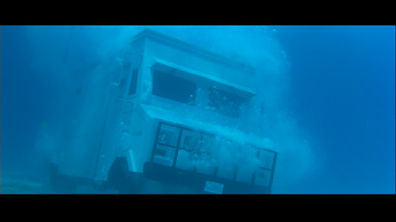 Goof: In the two pictures below you can clearly see cables attached to the roof of the truck. These were used to lower the truck into and out of the water. The shot was not framed well enough to cut out the cables so we see them.