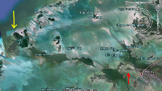 In the picture below the yellow arrow points to Snipe Point while the red arrow points to the Sugarloaf Shores Airport where Sanchez had landed at the start of the film.