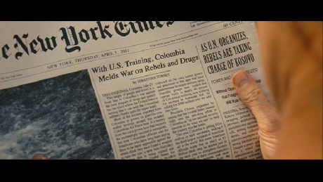 We see John walk out of the house and pick up the Times in his driveway. He reads Sebastian’s front page story. Goof: If you look at the story you will see in the second column where Columbia is requesting more funds for the war on drugs. There is a quote from President Clinton. However if you look at the top of the paper the date is April 5, 2001. Clinton is several months out of office and the President was G. W. Bush.