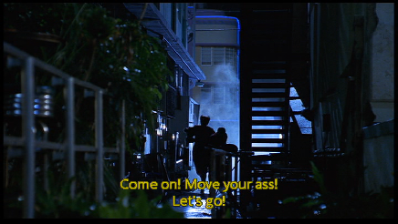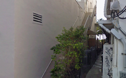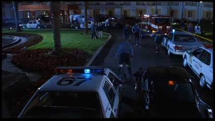 The bad guys show up and Julie and Marcus have to exit via the fire escape on the south side of the Tides Building. The fat bad guy follows them while the other one exits the front door of the Tides Hotel. As Julie and Marcus escape in the alley way, the Senator hotel (seen in the Miami Vice episode, Milk Run) can be seen in the background. Now a parking lot.