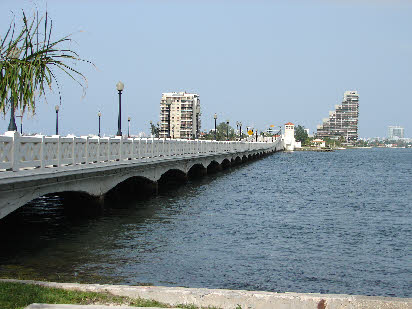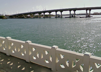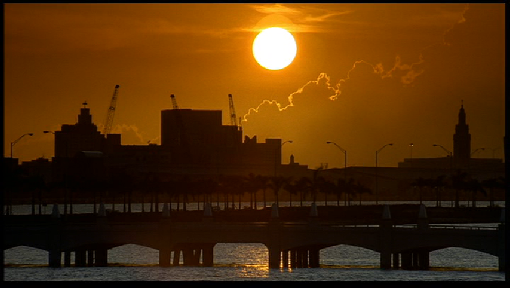 The crew steals a load of drugs from the evidence room and gets away. Then we see an establishing shot of the Fountain Street Bridge (Palm Island) with Miami in the distant background.