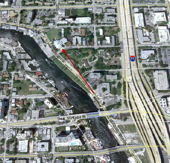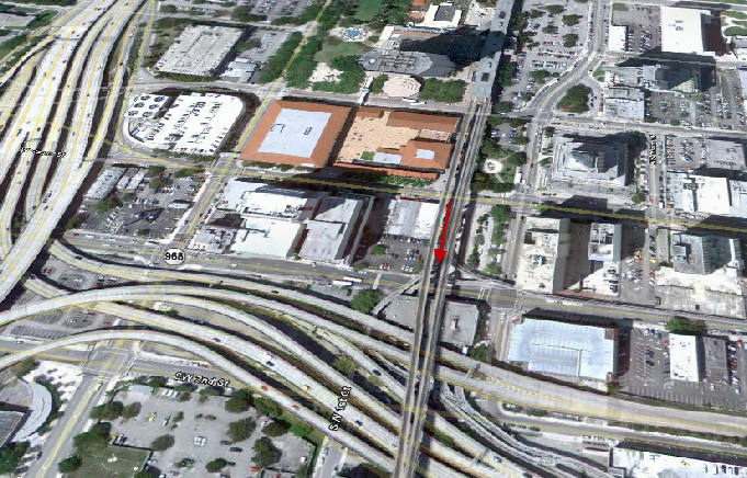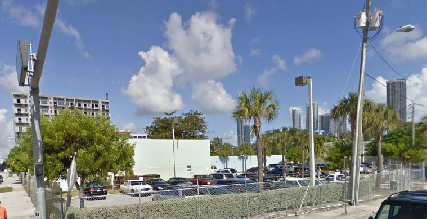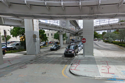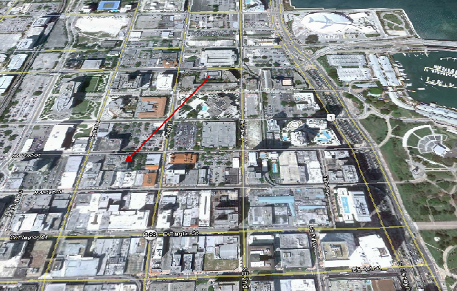 Then we see the opening credits. At the end of the credits we are in downtown Miami. According to the dialog they are on South Miami at 1st Street. In real life they are not far off. They were traveling southbound on SW 1 Ave under the metrorail. They are headed away from West Flagler Street toward SW 1st Street. The Dade County Courthouse can be seen in the background on the right side of the screen.