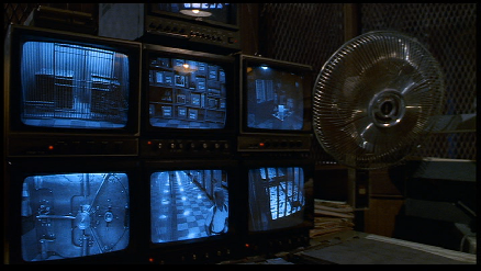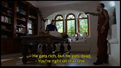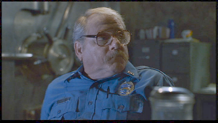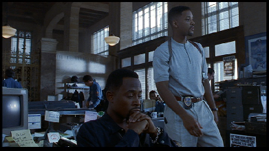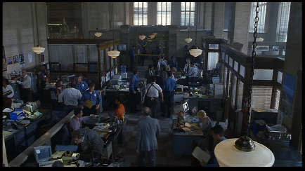 Then it cuts to the interior of the Police Department. This was filmed inside the Dupont Building. The Duont Building is located at 169 East Flagler Street in downtown Miami. I recognized this location because the USA Network show, Burn Notice has used this location a couple of times, most notably as Michael’s Bank in the series' Pilot. The bank’s beautiful old vault door can be seen behind the guard.