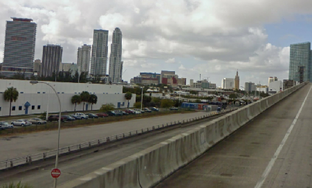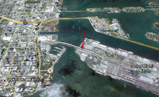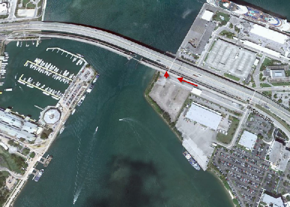 The movie starts off with our two main characters, Mike Lowry and Marcus Burnett (?Sonny Burnett, Miami Vice tie in) driving in Mike’s Porsche. They are driving eastbound on the Port of Miami bridge.