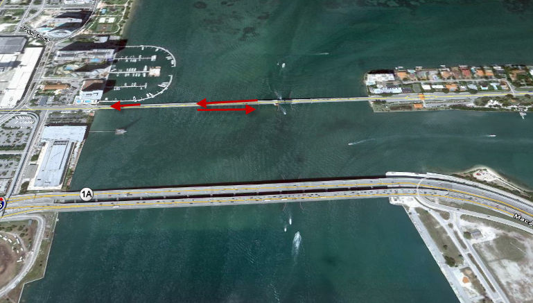 Then we see Marcus and Mike driving in a car first westbound on the Venetian causeway then eastbound. They repeat this change of direction several times as they are seen driving over the same stretch of road repeatedly. The new bridge to Watson Island can be seen in the background. After arguing they end up breaking into their rendition of the Bad Boys song.
