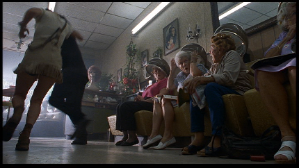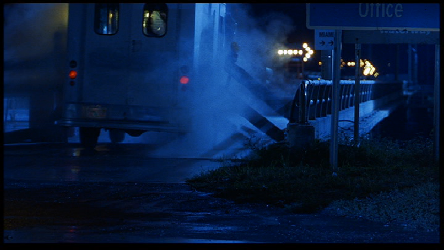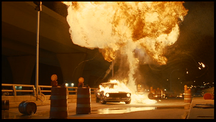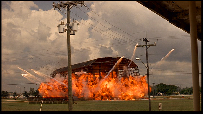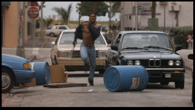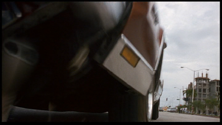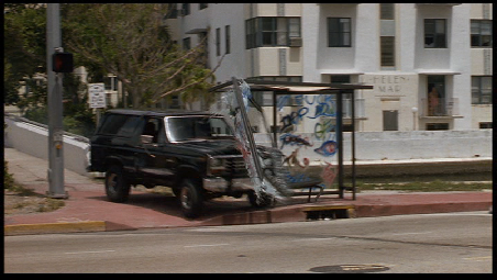 They run across the street and enter into the Paris Theater, 550 Washington Avenue. This is the filming location used in the Miami Vice episode, Tale of The Goat. Where Legba was laid out in the Voodoo church (theater food counter). They run through the converted theater and out onto its roof. In the background we can see the construction of the beast at the SW corner of Washington Ave. and 5th Street (438 Washington). We also see this construction in the background as the second collision occurs, complete with the police officer holding up traffic to allow for the scene to be filmed uninterrupted.