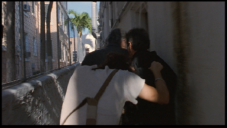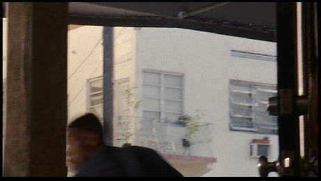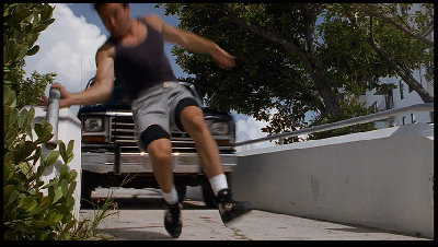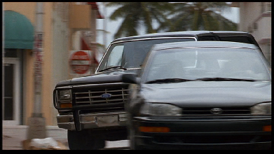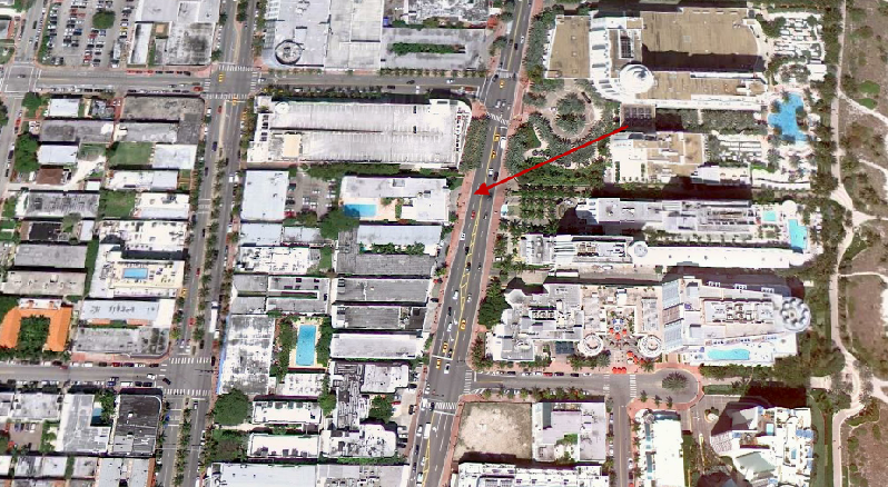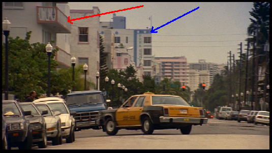 The camera pans to see the bad guys getting away in the cab. Only we would not be able to see them in real life because they are more than 14 blocks away. This was shot on Ocean Drive, from the 100 block looking north past Marjory Stoneman Douglas Ocean Beach Park. The Central Park Hotel (blue arrow below) and the distinctive balconies on 260 Ocean Drive (red arrow in the screen capture below) can be seen in the background. The bad guys take a left (westbound) onto 2nd Street and get away.