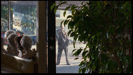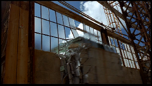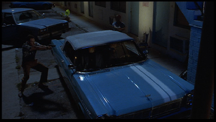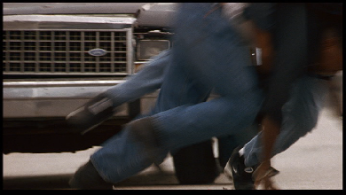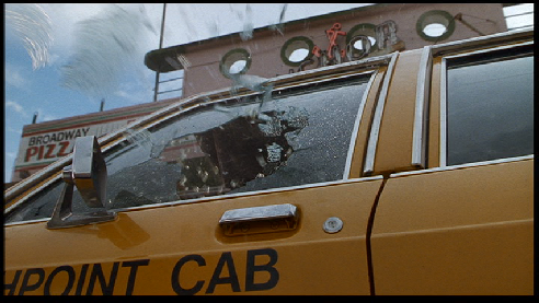 As they steal a taxi and shoot the driver in front of the Anchor Hotel, Marcus who is 10 blocks away outside the Paris Theater hears the shot and comes running. As they start to drive off Marcus catches up and dives on the roof of the taxi.