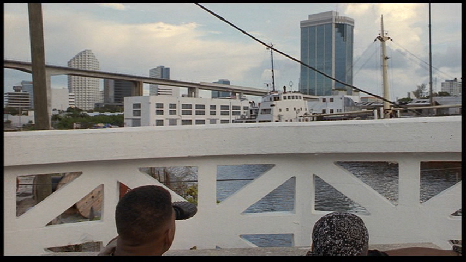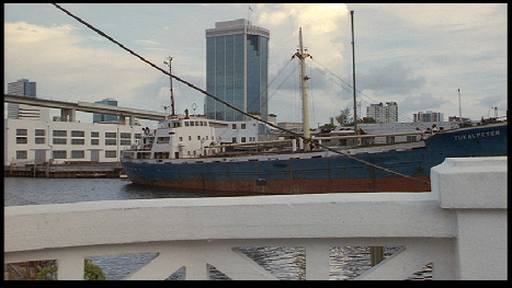 They follow the chemist when he leaves the house. He goes to the Miami River at SW 2nd. Ave. He enters a ship (the Yukalpeten) on holy ground for Miami Vice fans. This scene is nearly identical to the scene near the end of Miami Vice episode 7, No Exit. They follow Tubb’s and Bruce Willis’ character, Tony Amato to this same location. Only in that episode the ship is parked on the opposite bank of the river up against the power station. Stan and Larry in the van stop on the bridge and look down on Tubbs as he is entering the ship. Nearly identical scene played out in the same location 10+ years earlier. In Miami Vice world they could have run to the O.C.B. and gotten backup without a phone call because the HQ was just past where the ship is tied up.