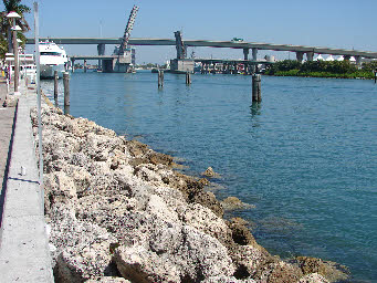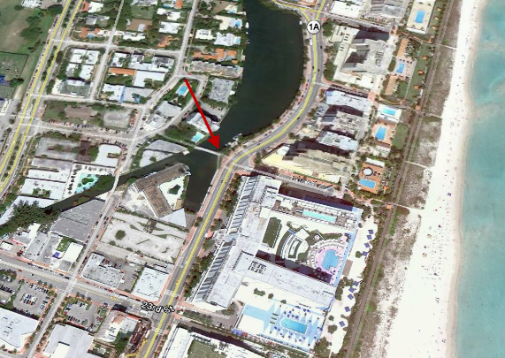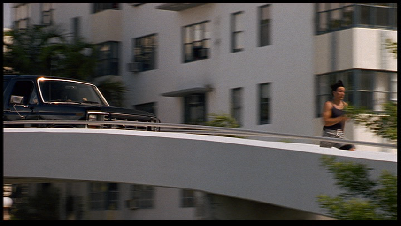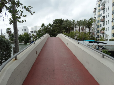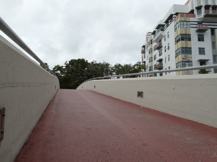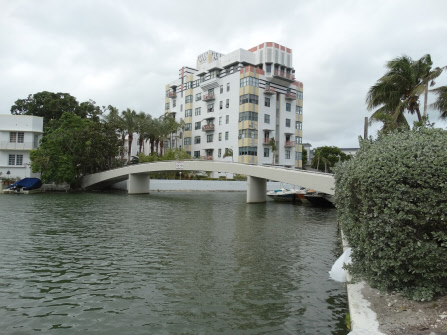 Then we see them racing across the pedestrian bridge that runs from 24th Street over to Collins Ave. This is where the boat jumped from the canal across the road at the end of the chase in the teaser of Lend Me An Ear, episode 62 of Miami Vice. The bad guys nearly run over a guy on the bridge while driving away from Mike who is on foot chasing them.