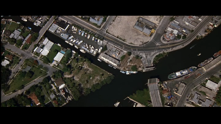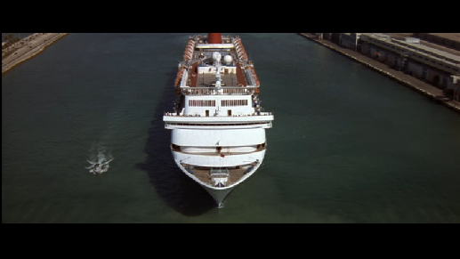 Next we see a quick aerial shot of a cruise ship in Government Cut.