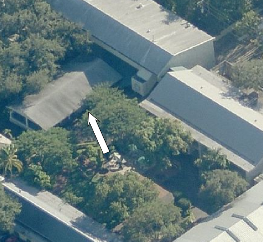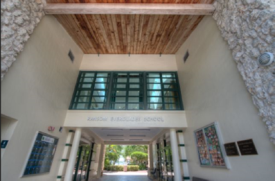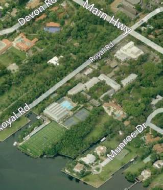 Then we arrive at Blue Bay High School. Filmed on location flying in westbound over the bay we see Ransom Everglades School. 3575 Main Highway, Miami.
