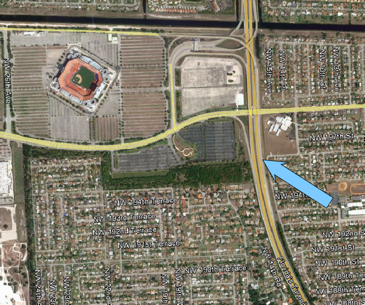 Then we see a caravan headed to the stadium, northbound on the Florida Turnpike.