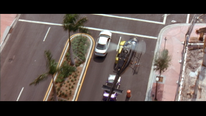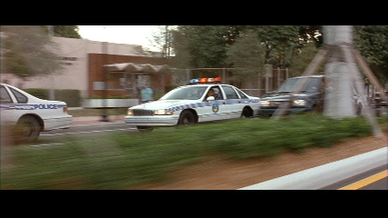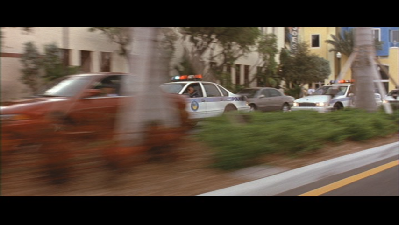 Goof: Extra police cars and spectators watching the filming are clearly seen on the right side of the screen.