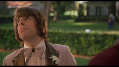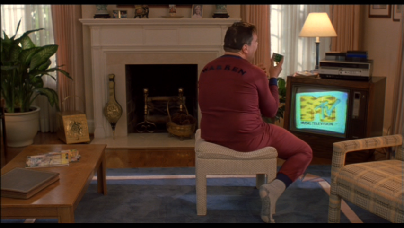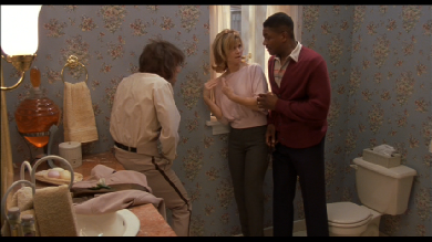 Then Mary’s Dad opens the door. Here we have switched houses for the interior shots. We are now, I believe (98%) at 4409 Santa Maria Street which we saw in the background earlier. I have not been inside to confirm this 100% but all evidence points to this being the filming location for all the interior scenes except for the bathroom scene. Note that now there are not any shrubs by the house but a line of shrubs has instantly grown up by the road. We now see 4430 and 4412 Santa Maria Street in the background and between them and further back we see the Biltmore golf course.