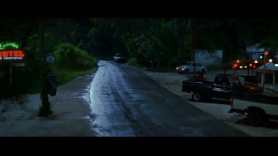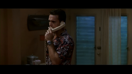 Intercut we see Sam talking via telephone to Kelly from the Glades Motel. The interior of the Glades Motel was either filmed on set at Greenwich Studios or the motel set built on location opposite Jimbo’s on Arthur Lamb Jr. Road, Virginia Key.