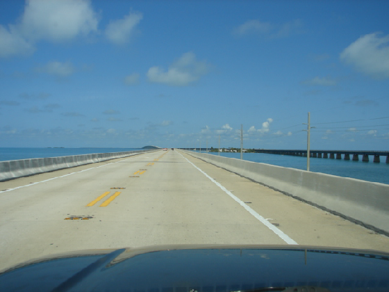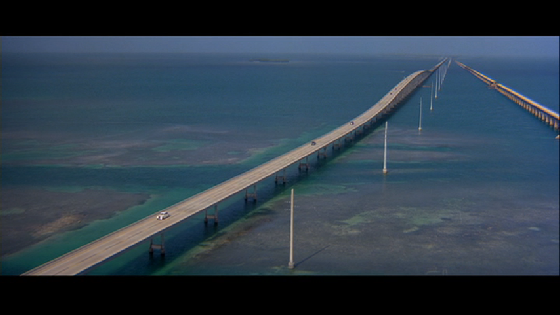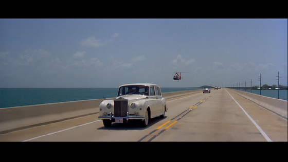 The scene cuts to Felix Leiter riding with James Bond and Sharkey on the way to Felix Leiter's wedding. They are northbound on the northern half of 7 mile Bridge.
