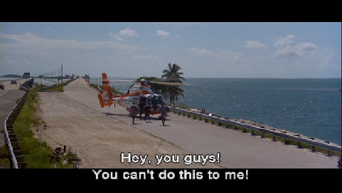 The Coast Guard helicopter with Felix's DEA friends picks up James Bond and Felix.