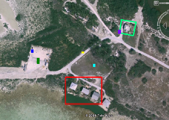 In the picture above we see the Sugarloaf Shores Airport area. The house that I drew the light green square around is the house that Lupe was shacked up in with her boyfriend. The purple box next to it is where we see Sanchez and his men approach the house. The yellow rectangle is where Sanchez leaps from his jeep. The light blue rectangle is where James leaps from the helicopter and takes up concealment behind the barrels. The red square is drawn around the houses we see in the background of the jeep attack on James. The darker green rectangle is where Sanchez's jet was parked. The blue rectangle is where Sanchez gets into the small plane to get away.